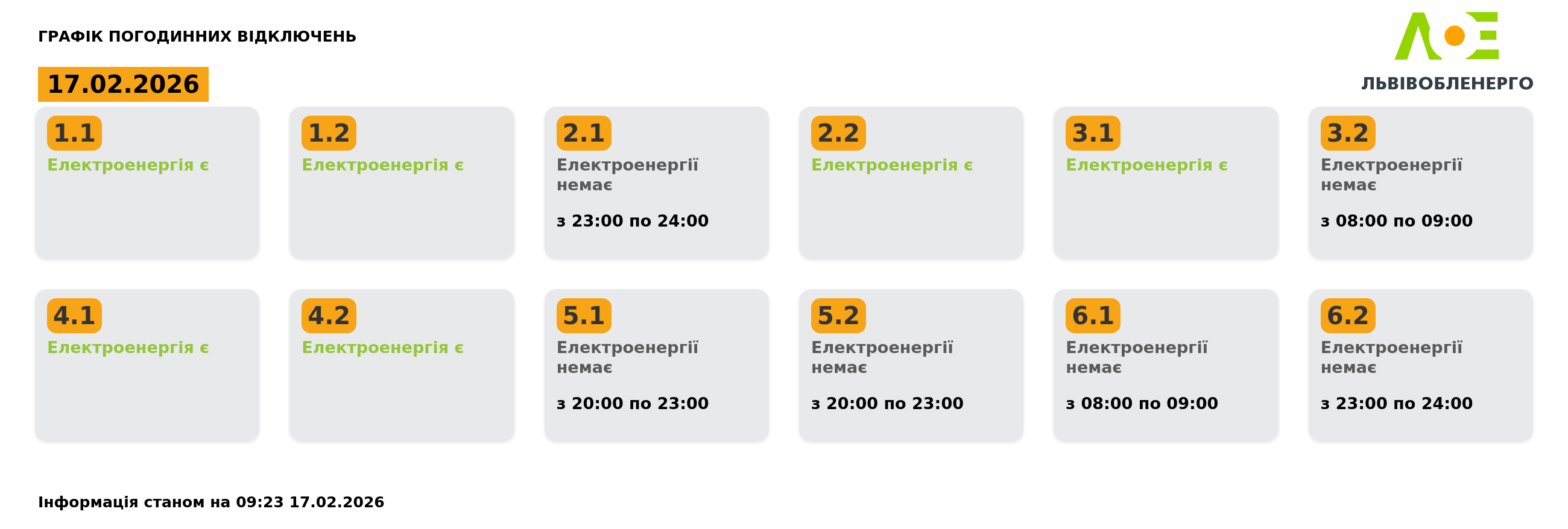 У вівторок, 17 лютого, на Львівщині будуть діяти графіки відключення світла. Світло вимикатимуть усім групам впродовж доби. Про це повідомили у Львівобленерго. Актуальний графік Інформація станом на 09:23 17.02.2026 Група 1.1. Електроенергія є. Група 1.2. Електроенергія є. Група 2.1. Електроенергії немає з 23:00 до 24:00. Група 2.2. Електроенергія є. Група 3.1. Електроенергія є. Група 3.2. Електроенергії немає з 08:00 до 09:00. Група 4.1. Електроенергія є. Група 4.2. Електроенергія є. Група 5.1. Електроенергії немає з 20:00 до 23:00. Група 5.2. Електроенергії немає з 20:00 до 23:00. Група 6.1. Електроенергії немає з 08:00 до 09:00. Група 6.2. Електроенергії немає з 23:00 до 24:00. Як дізнатися свою групу відключень До слова, дізнатись свою чергу аварійних чи погодинних відключень можна: на сайті “Львівобленерго” у розділі «Чому немає світла»: https://poweron.loe.lviv.ua/ У чат-ботах: “Львівобленерго” у Viber (для побутових споживачів): https://www.viber.com/loebot “Львівобленерго” у Telegram (для побутових споживачів): https://t.me/loeserviceBot “Львівобленерго Бізнес” у Viber (для юридичних споживачів): www.viber.com/loebiznesbot “Львівобленерго Бізнес” у Telegram (для юридичних споживачів): https://t.me/loebiznesbot у мобільному застосунку КомКом: https://loe.lviv.ua/page/komkom-app