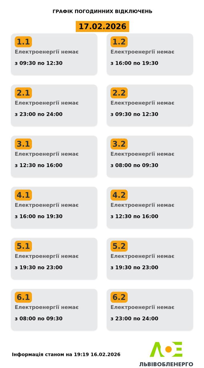 У вівторок, 17 лютого, на Львівщині будуть діяти графіки відключення світла. Світло вимикатимуть усім групам впродовж доби. Про це повідомили у Львівобленерго. Актуальний графік Інформація станом на 19:19 16.02.2026 Група 1.1. Електроенергії немає з 09:30 до 12:30. Група 1.2. Електроенергії немає з 16:00 до 19:30. Група 2.1. Електроенергії немає з 23:00 до 24:00. Група 2.2. Електроенергії немає з 09:30 до 12:30. Група 3.1. Електроенергії немає з 12:30 до 16:00. Група 3.2. Електроенергії немає з 08:00 до 09:30. Група 4.1. Електроенергії немає з 16:00 до 19:30. Група 4.2. Електроенергії немає з 12:30 до 16:00. Група 5.1. Електроенергії немає з 19:30 до 23:00. Група 5.2. Електроенергії немає з 19:30 до 23:00. Група 6.1. Електроенергії немає з 08:00 до 09:30. Група 6.2. Електроенергії немає з 23:00 до 24:00. Як дізнатися свою групу відключень До слова, дізнатись свою чергу аварійних чи погодинних відключень можна: на сайті “Львівобленерго” у розділі «Чому немає світла»: https://poweron.loe.lviv.ua/ У чат-ботах: “Львівобленерго” у Viber (для побутових споживачів): https://www.viber.com/loebot “Львівобленерго” у Telegram (для побутових споживачів): https://t.me/loeserviceBot “Львівобленерго Бізнес” у Viber (для юридичних споживачів): www.viber.com/loebiznesbot “Львівобленерго Бізнес” у Telegram (для юридичних споживачів): https://t.me/loebiznesbot у мобільному застосунку КомКом: https://loe.lviv.ua/page/komkom-app