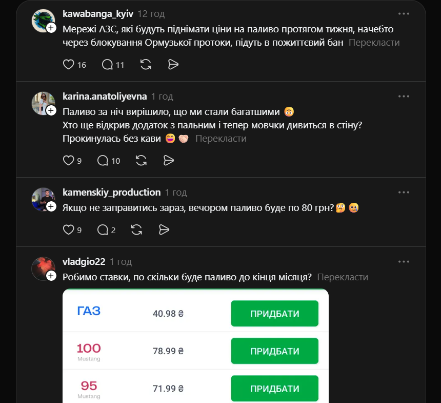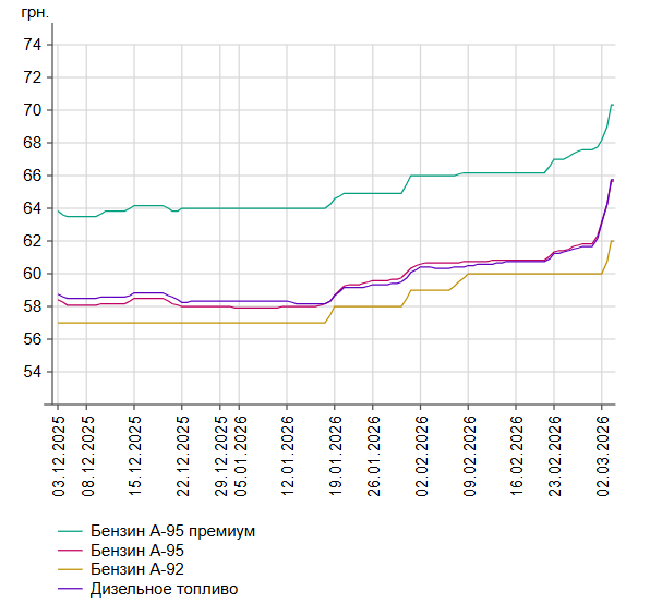 За добу ціни на пальне в Україні зросли в середньому на 2 гривні за літр. Популярний бензин А-95 у Львові подекуди вартує майже 70 гривень. Директор “Консалтингової групи “А-95” Сергій Куюн розповів LVIV.MEDIA про причини здорожчання пального та прогнози щодо подальшої ситуації з цінами на заправках. На скільки подорожчало пальне за день Вид палива. Ціна . Зростання за добу. Бензин А-95 преміум. 70,31 грн. +2.17 грн (+3%). Бензин А-95. 65,64 грн. +2.50 грн(+4%). Бензин А-92. 61,99 грн. +2.00 (+3%). Дизельне паливо. 65,77 . +2.70 (+4%). Газ автомобільний. 39,60. +0.75 (+2%). Українські водії в соцмережах обурилися та активно обговорюють зростання цін на АЗС. Користувачі побоюються подальшого здорожчання пального. Які ціни на заправках у Львові та області У Львові ціни на популярних АЗС, зокрема на бензин 95, наступні: WOG — 68,99 грн/л ОККО — 68,99 грн/л SOCAR — 68,99 грн/л Ukrnafta — 65,99 грн/л UPG — 65,90 грн/л Тим часом у Львівській області, за даними Мінфіну, ціни на заправках наступні: Оператор. А 95+. А 95. А 92. ДП. Газ. AMIC. 67,99. 63,99. 65,49. 38,49. Chipo. 64,40. 64,60. 39,50. SOCAR. 71,99. 68,99. 68,99. 39,98. UPG. 68,90. 65,90. 65,90. 40,10. WOG. 71,99. 68,99. 68,99. 40,98. БРСМ-Нафта. 60,99. 59,99. 37,79. Маркет. 62,49. 62,99. ОККО. 71,99. 68,99. 68,99. 40,99. Укрнафта. 65,99. 61,99. 65,99. 38,99. Чому зросли ціни на пальне За словами експерта паливного ринку Сергія Куюна, здорожчання цін на пальне пов’язане із війною в Ірані. “Це найбільший такий нафтогазовий вузол, мабуть, всієї планети. Відповідно, всі нервують, всі побоюються того, що може бути дестабілізація постачань, нестача ресурсів, і вже ринки реагують таким чином. В принципі, це класична реакція, але вона досить помірна. Нас лякали здорожчанням до 100-200 доларів за барель нафти. Насправді, вчора відкрилися ринки з позначкою 82 долари — це на 13% більше, ніж п'ятниця.”, — зазначив директор “Консалтингової групи “А-95”. Сергій Куюн зауважив, що станом на 3 березня ціна за барель нафти впала на 2 долари — до 80. За умови, що війна на Близько Сході швидко закінчиться, барель може впасти в ціні нижче 60 доларів. Чи будуть зростати ціни надалі Директор “Консалтингової групи “А-95” переконаний, що надалі ціни зростати не будуть. “Та паніка, яка в когось там проскакує, що треба щось купити, з каністрами. Я думаю, що ці люди наступного тижня пожалкують, що вони це зробили. Днями, коли ситуація проясниться, ця ажіотажна націночка зникне”, — підсумував Сергій Куюн. Тим часом засновник групи компаній Prime, паливний експерт Дмитро Льоушкін у коментарі виданню УНІАН спрогнозував, що внаслідок бойових дій в Ірані ціни на АЗС можуть збільшитись на 5 гривень, за умови якщо ціна на нафту не перевищуватиме 80 доларів за барель. За умови, якщо ціни на нафту перевищать 100 доларів за барель, то вартість бензину та дизелю в Україні може зрости на 10 гривень, розповів експерт.