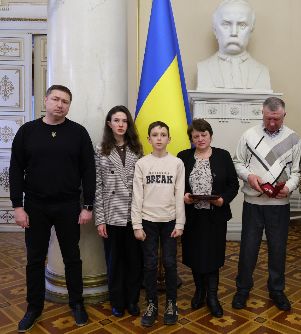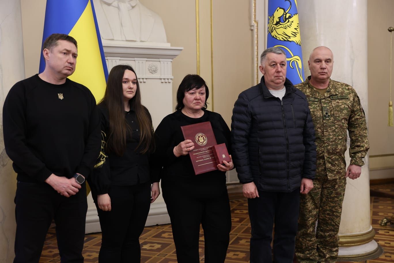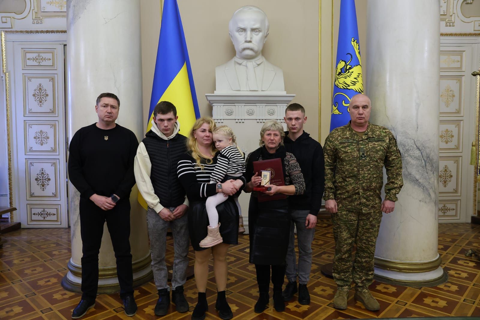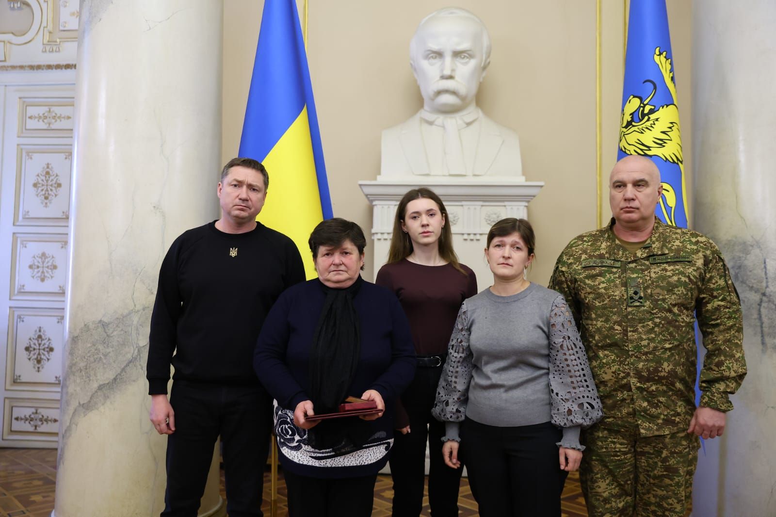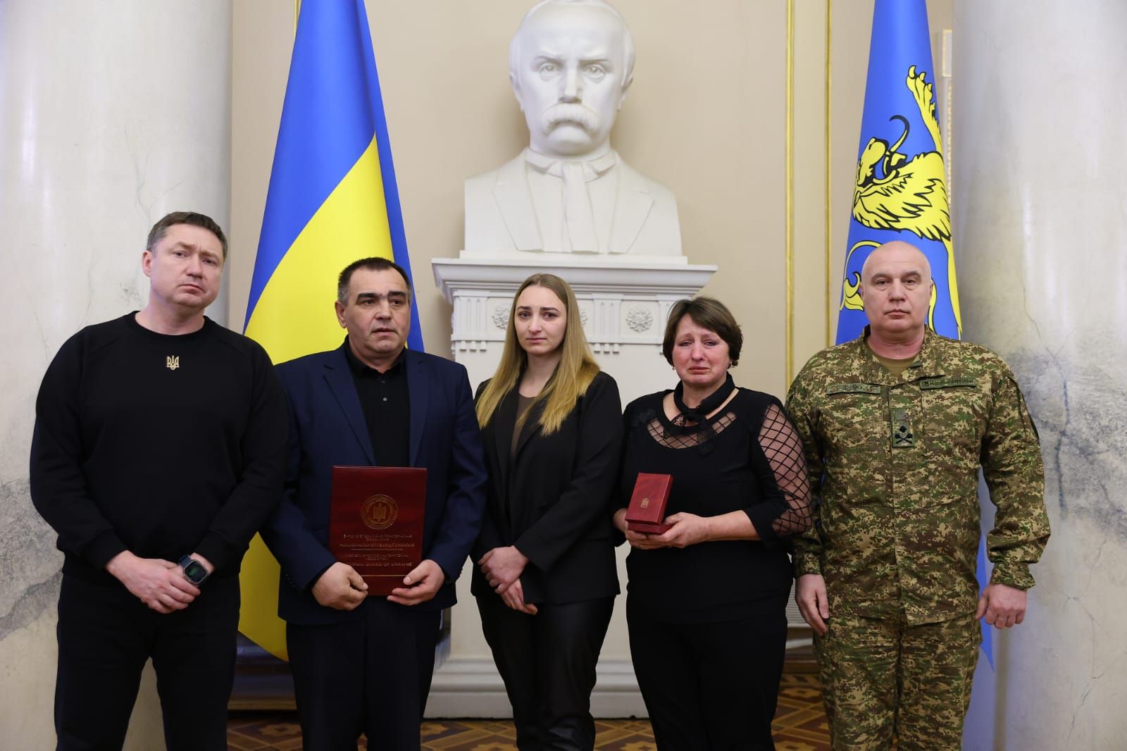 Начальник Львівської ОВА Максим Козицький разом із начальником Західного територіального управління Національної гвардії України бригадним генералом Юрієм Дремухом вручили нагороди родинам 13 нацгвардійців зі Львівщини, які загинули під час виконання службового та громадянського обов’язку. Орденами та медалями «За мужність» і «Захиснику Вітчизни» посмертно відзначили героїв, які віддали своє життя за Україну. Про це 4 березня повідомив очільник Львівщини Максим Козицький. «Це дуже важко та боляче. І всі слова втрачають сенс. Але маємо вірити, що зустрінемо наших Героїв у вічності», — зазначив Максим Козицький. Імена нагороджених героїв Серед нагороджених — захисники, що віддали своє життя за Україну. Орденом «За мужність» ІІІ ступеня посмертно нагородили солдатів та старших солдатів з різних куточків Львівщини: Мар'яна Угурського (26 років) з Уличного, Дрогобицький район. Андрія Бенюха (36 років) зі Станкова, Стрийський район. Богдана Пундора (27 років) з Межиріччя, Стрийський район. Михайла Франківа (39 років) зі Скваряви, Золочівський район. Тараса Гайду (36 років) із Суховолі, Львівський район. Василя Гуменюка (34 роки) з Торгова, Золочівський район. Андрія-Назара Романюка (22 роки) зі Львова. Андрія Панасюка (30 років) з Великих Грибовичів, Львівський район. Павла Марковського (39 років) із Золочева. Руслана Шевченка (26 років) із Зарудців, Львівський район. Олега Дацишина зі Жашковичів, Львівський район. Медаллю «Захиснику Вітчизни» посмертно нагородили старшого сержанта Володимира Левицького (25 років) зі Львова. Також, орденом «За мужність» ІІІ ступеня та медаллю «Захиснику Вітчизни» відзначено сержанта Івана Лічного (50 років) зі Шептицького. «Дорогі рідні наших воїнів, ми розуміємо: жодна нагорода не поверне чоловіка, не обійме замість тата, не замінить сина. Вся наша область і держава щиро співчувають вашій втраті та вдячні вашим близьким за чин. Вони – будівничі нової історії України. Ви не самі. Ми – поруч. Офіс підтримки родин військових – також», — додав Максим Козицький.