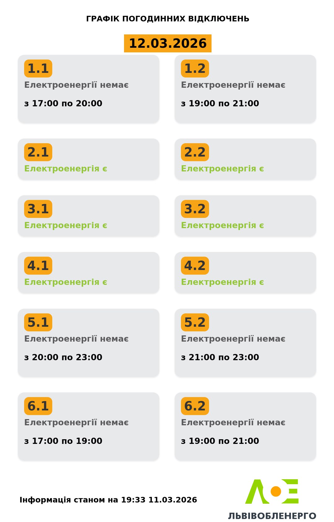 У четвер, 12 березня, на Львівщині будуть діяти графіки відключення світла. Світло вимикатимуть декільком групам впродовж доби. Про це повідомили у Львівобленерго. Актуальний графік Інформація станом на 19:33 11.03.2026 Група 1.1. Електроенергії немає з 17:00 до 20:00. Група 1.2. Електроенергії немає з 19:00 до 21:00. Група 2.1. Електроенергія є. Група 2.2. Електроенергія є. Група 3.1. Електроенергія є. Група 3.2. Електроенергія є. Група 4.1. Електроенергія є. Група 4.2. Електроенергія є. Група 5.1. Електроенергії немає з 20:00 до 23:00. Група 5.2. Електроенергії немає з 21:00 до 23:00. Група 6.1. Електроенергії немає з 17:00 до 19:00. Група 6.2. Електроенергії немає з 19:00 до 21:00. Як дізнатися свою групу відключень До слова, дізнатись свою чергу аварійних чи погодинних відключень можна: на сайті “Львівобленерго” у розділі «Чому немає світла»: https://poweron.loe.lviv.ua/ У чат-ботах: “Львівобленерго” у Viber (для побутових споживачів): https://www.viber.com/loebot “Львівобленерго” у Telegram (для побутових споживачів): https://t.me/loeserviceBot “Львівобленерго Бізнес” у Viber (для юридичних споживачів): www.viber.com/loebiznesbot “Львівобленерго Бізнес” у Telegram (для юридичних споживачів): https://t.me/loebiznesbot у мобільному застосунку КомКом: https://loe.lviv.ua/page/komkom-app