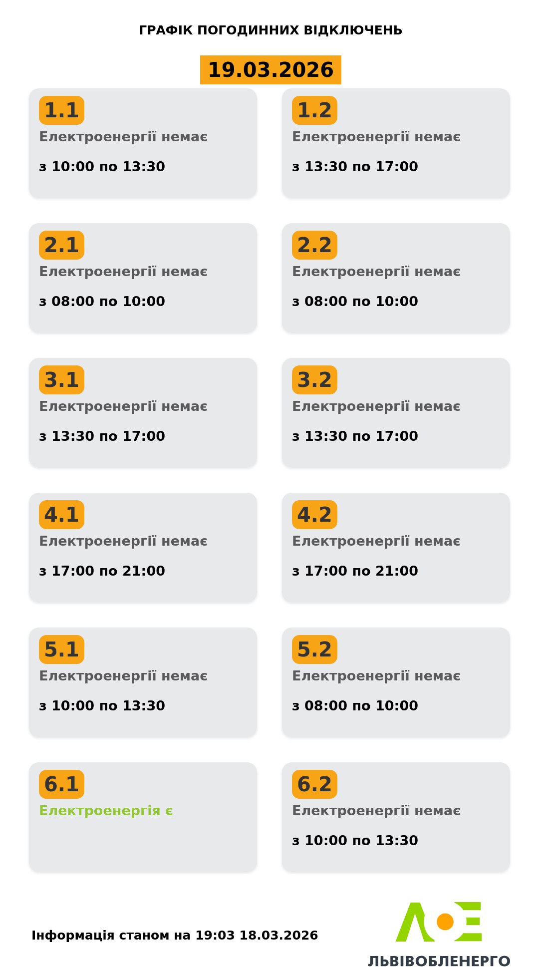 У четвер, 19 березня, на Львівщині діятимуть графіки відключення світла. Електроенергію вимикатимуть майже усім групам протягом дня. Про це повідомили у Львівобленерго. Актуальний графік Інформація станом на 19:03 18.03.2026 Група 1.1. Електроенергії немає з 10:00 до 13:30. Група 1.2. Електроенергії немає з 13:30 до 17:00. Група 2.1. Електроенергії немає з 08:00 до 10:00. Група 2.2. Електроенергії немає з 08:00 до 10:00. Група 3.1. Електроенергії немає з 13:30 до 17:00. Група 3.2. Електроенергії немає з 13:30 до 17:00. Група 4.1. Електроенергії немає з 17:00 до 21:00. Група 4.2. Електроенергії немає з 17:00 до 21:00. Група 5.1. Електроенергії немає з 10:00 до 13:30. Група 5.2. Електроенергії немає з 08:00 до 10:00. Група 6.1. Електроенергія є. Група 6.2. Електроенергії немає з 10:00 до 13:30. Як дізнатися свою групу відключень До слова, дізнатись свою чергу аварійних чи погодинних відключень можна: на сайті “Львівобленерго” у розділі «Чому немає світла»: https://poweron.loe.lviv.ua/ У чат-ботах: “Львівобленерго” у Viber (для побутових споживачів): https://www.viber.com/loebot “Львівобленерго” у Telegram (для побутових споживачів): https://t.me/loeserviceBot “Львівобленерго Бізнес” у Viber (для юридичних споживачів): www.viber.com/loebiznesbot “Львівобленерго Бізнес” у Telegram (для юридичних споживачів): https://t.me/loebiznesbot у мобільному застосунку КомКом: https://loe.lviv.ua/page/komkom-app