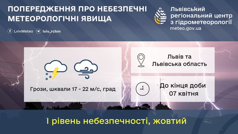 У Львові та області мешканців попередили про небезпечні метеорологічні явища. За прогнозом синоптиків, погода погіршиться у найближчу годину. Про це повідомили у Львівському регіональному центрі з гідрометеорології у вівторок, 7 квітня. Погіршення погоди прогнозують у Львові та області Прогнозують грозу також і у Львові. Крім того будуть шквали вітру зі швидкістю 17–22 м/с і град. У зв’язку з погіршенням погодних умов оголошено І рівень небезпечності — жовтий. Мешканцям та гостям міста рекомендують за можливості уникати перебування під деревами, рекламними щитами та лініями електропередач. Водіям варто бути особливо уважними на дорогах через можливі опади та погіршення видимості.