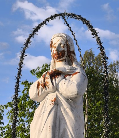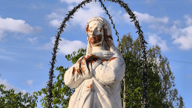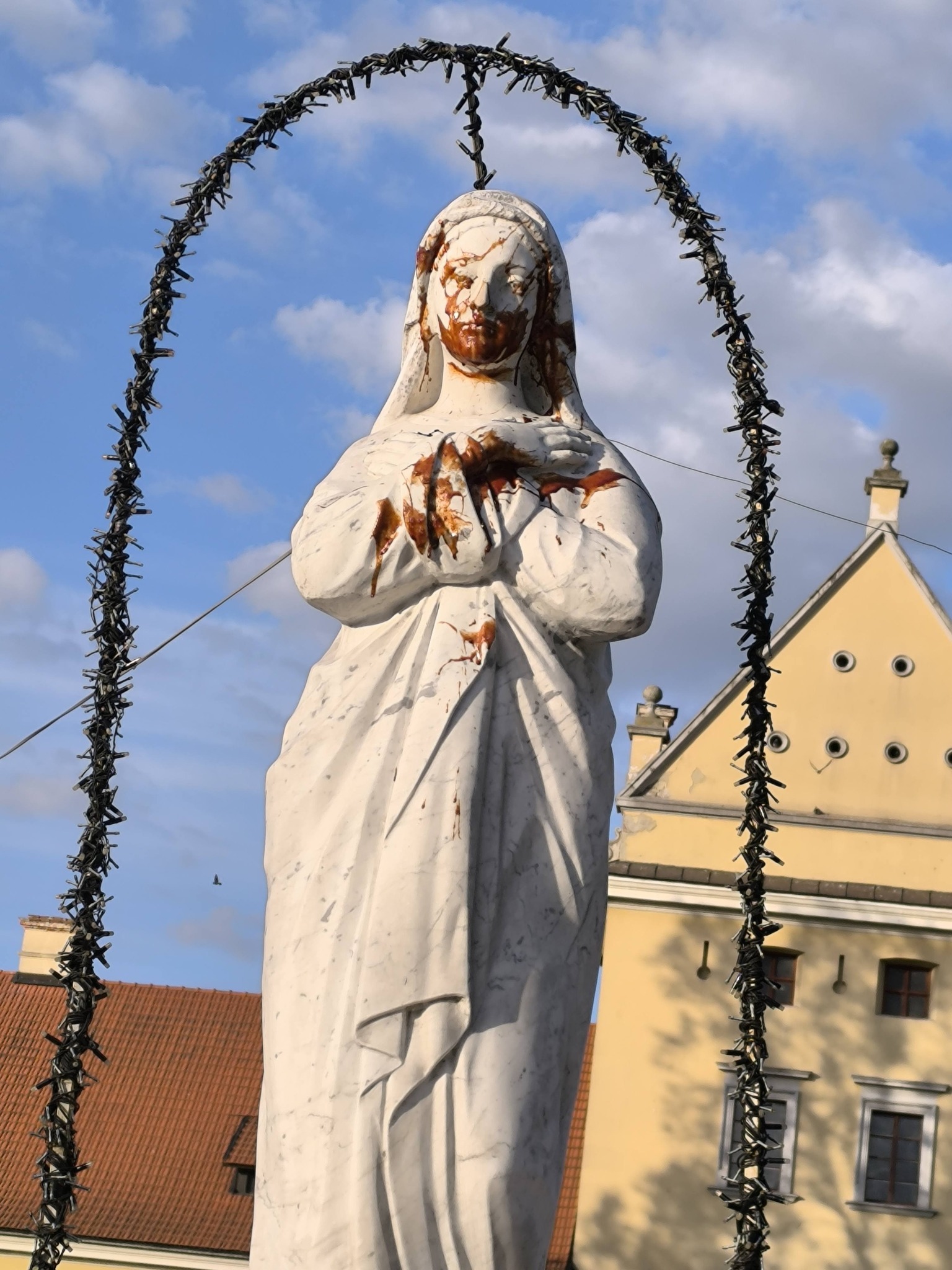 У Жовкві невідомі облили червоною рідиною фігуру Божої Матері у центрі міста. Правоохоронці розшукують вандалів, про це LVIV.MEDIA повідомили у поліції Львівської області. Фігуру Божої Матері біля Жовківського замку облили червоною рідиною Про акт вандалізму вранці, 28 квітня, повідомили у Жовківському міському виробничому управлінні житлово-комунального господарства та оприлюднили фото спаплюженої скульптури. Як зазначили у поліції, факт пошкодження фігури Божої Матері виявили під час патрулювання на площі Вічевій. Невідомі забруднили сакральну споруду червоною рідиною. “На місце події було негайно скеровано слідчо-оперативну групу. Було проведено огляд місця події. Встановлюються обставини, вивчаються відео з камер спостереження. Проводяться заходи щодо встановлення особи, причетної до скоєння цього правопорушення. Вирішується питання правової кваліфікації”, — зазначили LVIV.MEDIA у поліції. Усіх, хто володіє будь-якою інформацією, або став свідком цієї події, просять звертатись на оперативну лінію “102”, або до територіального підрозділу поліції.