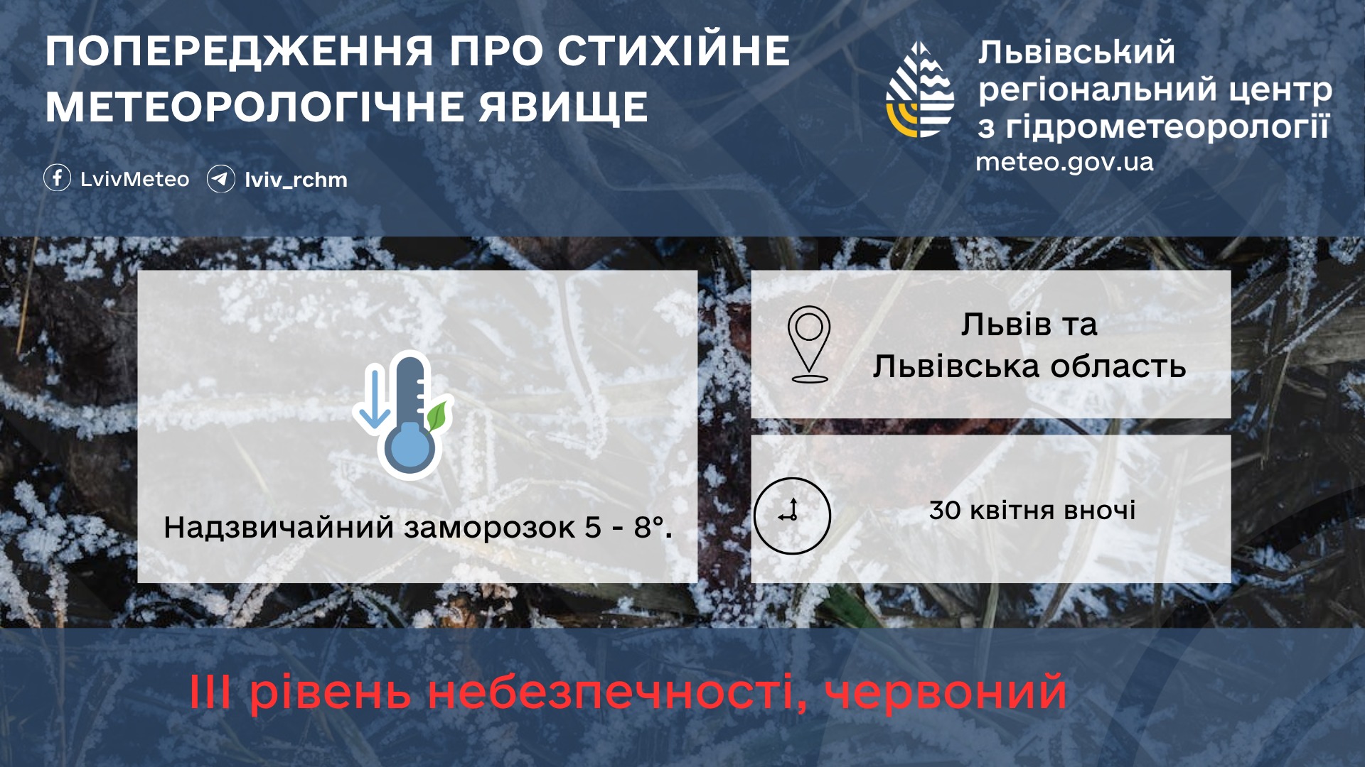 На Львівщині у найближчі дні прогнозують дводенне похолодання, після якого прийде потепління. Про це повідомили у Львівському регіональному центрі з гідрометеорології у середу, 29 квітня. Температура опуститься до -8°C За прогнозом синоптиків, в області уночі 30 квітня спостерігатиметься надзвичайний заморозок. Температура опуститься до -8°C. Уже наступної ночі п’ятниці на Львівщині буде сильний заморозок із температурою морозу -3°C. У Львові також прогнозують похолодання. 30 квітня вночі стовпчики термометрів опустяться до -6°C, а уночі 1 травня слід очікувати заморозок із температурою -2°C. Похолодання цими днями буде останнім цієї весни У Львівському регіональному центрі з гідрометеорології LVIV.MEDIA розповіли, що це похолодання стане для Львівщини уже останнім цієї весни і надалі слід очікувати потепління. “30 квітня та 1 квітня ми ще очікуємо заморозки, особливо в гірській місцевості. З 2 по 6 травня буде поступово підвищення температур. 4 травня прогнозуємо до 20°C тепла вдень, нічні температури також поступово підніматимуться. Опадів у цей період не прогнозується”, — повідомили синоптики. Також синоптики на 20 квітня та 1 травня онолосили ІІІ (червоний) рівень небезпечності.