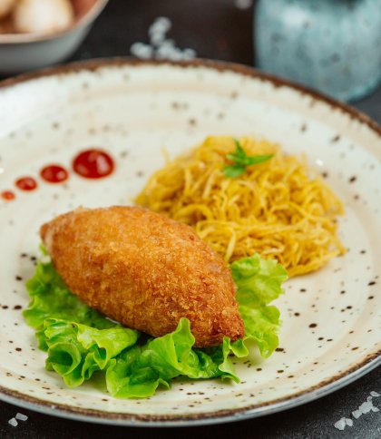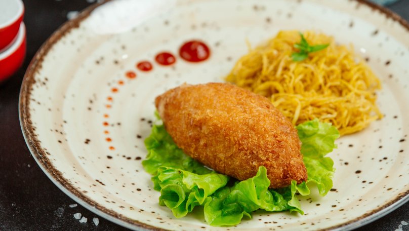 Котлеті по-київськи не потрібно зайвих рекомендацій. Ніжний курячий рулет з ароматним вершковим маслом усередині та хрусткою золотистою скоринкою давно став візитівкою не лише Києва, а й усієї України. Сьогодні котлета по-київськи відома далеко за межами країни й входить до меню ресторанів у різних куточках світу. У цьому матеріалі ділимося спрощеним рецептом котлети по-київськи. Історія появи котлети по-київськи Походження страви досі викликає суперечки серед кулінарів і дослідників гастрономії. Одна з найпоширеніших версій свідчить, що котлета по-київськи з’явилася на початку ХХ століття в київському ресторані Купецький клуб. Тоді її називали “котлета де воляй”. Згодом страва отримала нову назву, а разом із нею – і світову славу. Сьогодні котлета по-київськи однаково популярна і в дорогих ресторанах, і в демократичних кафе. Інгредієнти для приготування Щоб приготувати класичну котлету по-київськи, знадобляться прості продукти: куряче філе – 100 г; масло вершкове – 20 г; яйце куряче – 1 шт.; зелень – 2 г; борошно пшеничне – 50 г; панірувальні сухарі – 100 г. Як приготувати котлету по-київськи: покроковий рецепт Крок 1. Спочатку уважно огляньте куряче філе. Видаліть усі прожилки, плівки та зайвий жир, адже вони можуть зробити текстуру жорсткою. Далі зріжте тонкі пласкі частини, щоб шматок був рівномірної товщини. Це важливо, адже однакова товщина допоможе рівномірно загорнути начинку та уникнути розривів під час смаження. Крок 2. Свіжий кріп дрібно наріжте ножем. Холодне вершкове масло обкачайте в подрібненій зелені, злегка притискаючи, щоб кріп добре прилип. Сформуйте невеликий брусочок або кульку та покладіть у морозилку на 15-20 хвилин. Масло має стати твердим (так його легше загортати у філе). Крок 3. Покладіть філе між двома шарами харчової плівки або пергаменту. Акуратно відбийте кухонним молоточком, рухаючись від центру до країв. Не перестарайтеся: м’ясо має стати тоншим і м’яким, але без дірок. Крок 4. На центр відбитого філе викладіть підморожене масло з кропом. Щільно загорніть філе рулетом, підвертаючи бокові краї всередину, щоб масло було повністю закрите. Сформовані котлети викладіть на тарілку або дошку та поставте в морозилку приблизно на 20-30 хвилин. Вони повинні добре затвердіти й тримати форму. Крок 5. У мисці змішайте яйце з однією чайною ложкою води. Виделкою або вінчиком ретельно збийте суміш до однорідності. Крок 6. Підморожені котлети по черзі обваляйте: спочатку в борошні (воно створює основу для панірування), потім занурте в яйце, далі – у панірувальні сухарі, знову в яйце і ще раз у сухарі. Крок 7. Розігрійте олію до температури приблизно 180°C. Котлети обережно опустіть у гарячий фритюр. Смажте 1-1,5 хвилини до насиченого золотистого кольору. Крок 8. Обсмажені котлети перекладіть на деко, застелене пергаментом. Поставте у розігріту до 180°C духовку на 6-7 хвилин. За цей час м’ясо повністю приготується, а масло всередині розплавиться. Після духовки дайте котлеті по-київськи відпочити 1-2 хвилини, а потім обережно подавайте.