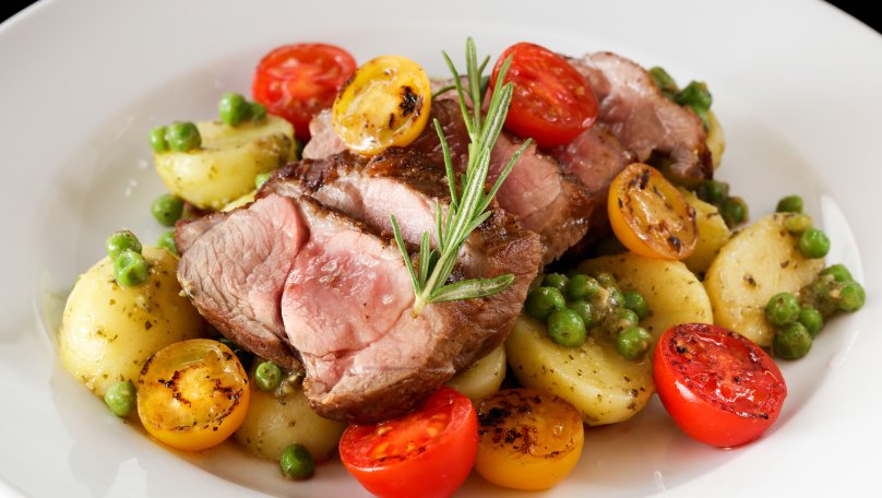 Соковите м’ясо з картоплею та запеченими помідорами має вигляд ресторанної страви, але готується дуже просто. Головний секрет полягає у правильному обсмаженні м’яса. Усередині воно має залишатися соковитим, а зверху повинна з’явитися рум’яна скоринка. Картопля, помідори та зелений горошок додають страві свіжості та роблять смак більш виразним. Ділимося простим рецептом м’яса з картоплею та помідорами, який легко приготувати вдома. Інгредієнти для м’яса з картоплею та помідорами Для приготування страви на 2-3 порції знадобиться: 500 г свинини (краще взяти ошийок або корейку); 500 г молодої картоплі; 150 г помідорів чері; 80 г зеленого горошку; 2 столові ложки оливкової олії; 1 гілочка розмарину; 2 зубчики часнику; сіль та чорний перець – на власний смак; сушені італійські трави – за бажанням; вершкове масло – 20 г. Покроковий рецепт м’яса з картоплею Крок 1. Свинину промийте, обсушіть паперовим рушником і наріжте великими шматками або медальйонами. Саме такі шматки добре зберігають соковитість під час обсмажування. Крок 2. Картоплю добре помийте та розріжте навпіл. Помідори чері також розріжте на половинки. Часник розчавіть ножем, не ріжте його, адже так він краще віддасть аромат під час смаження. Крок 3. Покладіть картоплю у підсолену воду та варіть приблизно 15-20 хвилин після закипання. Вона повинна стати майже готовою, але не розваритися. Після цього злийте воду та залиште картоплю трохи охолонути. Крок 4. Розігрійте сковороду з оливковою олією на середньо-сильному вогні. Свинину посоліть і поперчіть, після чого викладіть на гарячу сковороду. Обсмажуйте приблизно 3-4 хвилини з кожного боку, поки не утвориться золотиста скоринка. Крок 5. Наприкінці до сковороди додайте вершкове масло, часник і гілочку розмарину. Полийте м’ясо ароматним маслом зі сковороди – так воно стане ще соковитішим. Крок 6. Готове м’ясо перекладіть на тарілку та дайте йому “відпочити” 5 хвилин. Крок 7. У тій самій сковороді обсмажте відварену картоплю до рум’яної скоринки. Додайте трохи солі, перцю та сушених трав. Крок 8. До картоплі всипте зелений горошок і половинки помідорів чері. Готуйте ще 2-3 хвилини, щоб овочі стали м’якими, але зберегли свою форму. Крок 9. На велику тарілку викладіть картоплю з горошком та помідорами. Зверху покладіть нарізане соковите м’ясо. Для аромату додайте гілочку розмарину. Готову страву краще подавати гарячою.